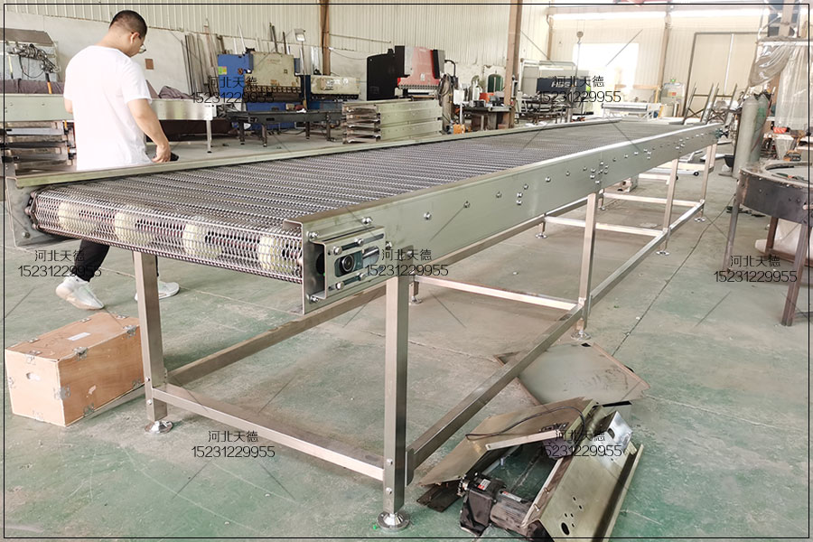 7.食品網(wǎng)帶輸送機(jī)可靠性高。結(jié)構(gòu)簡樸,運(yùn)動(dòng)部件自重輕,只要金屬網(wǎng)帶不被撕破,壽命可長達(dá)十年之上,而金屬結(jié)構(gòu)部件,只要防銹好,幾十年也不壞。